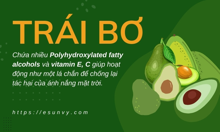 Nghiên cứu từ năm 2011 (1) cho thấy thành phần Polyhydroxylated fatty alcohols tách chiết từ trái bơ có thể giúp bảo vệ làn da của bạn khỏi tác hại của ánh nắng mặt trời và viêm nhiễm. Tia cực tím (UV) gây hại cho da của bạn có thể gây ra nếp nhăn, cũng như các dấu hiệu lão hóa khác và ung thư da.