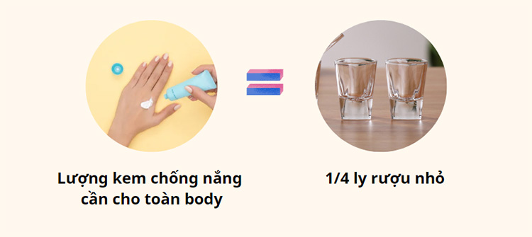 Vẫn với tỷ lệ nói trên, khi áp dụng cho da body, bạn cần dùng một lượng kem chống nắng khoảng 25 – 30mg tương đương 1/4 chén rượu nhỏ. Nhưng thông thường chỉ khi đi bơi hoặc ra bãi biển chúng ta mới cần apply lượng lớn kem chống nắng như vậy. Nếu làm việc trong điều kiện văn phòng hoặc đi dưới nắng không lâu, bạn chỉ cần bôi kem chống nắng phủ lên phần da tay và chân hoặc chỉ tay (nếu như mặc quần dài và đi giày).