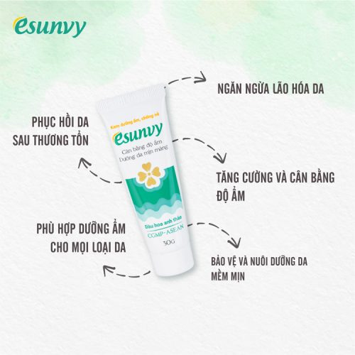 4. Kem dưỡng ẩm Esunvy 30g sở hữu thành phần dưỡng ẩm đặc biệt Dầu hoa anh thảo mang lại cơ chế dưỡng ẩm đầy đủ và tối ưu cho làn da. Mang lại làn da cân bằng độ ẩm, mịn màng.
