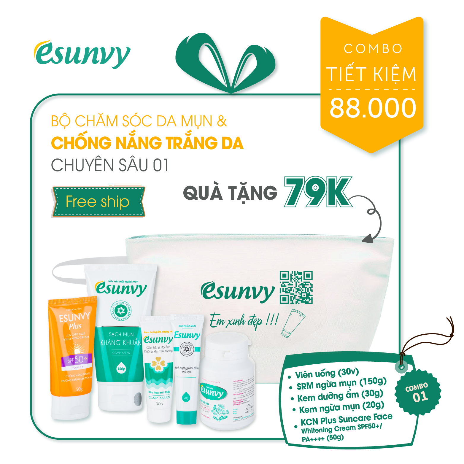 Bộ sản phẩm gồm 05 sản phẩm đáng sử dụng và được săn đón nhiều nhất của nhà Esunvy, với sự kết hợp của kem chống nắng dưỡng trắng yêu thích cùng bộ chăm sóc da cơ bản giúp chăm sóc làn da chuyên sâu và rạng ngời dưới nắng. Đặc biệt, vừa tiết kiệm đến 88.000 vnd, lại gấp 03 lần dung tích sữa rửa mặt.