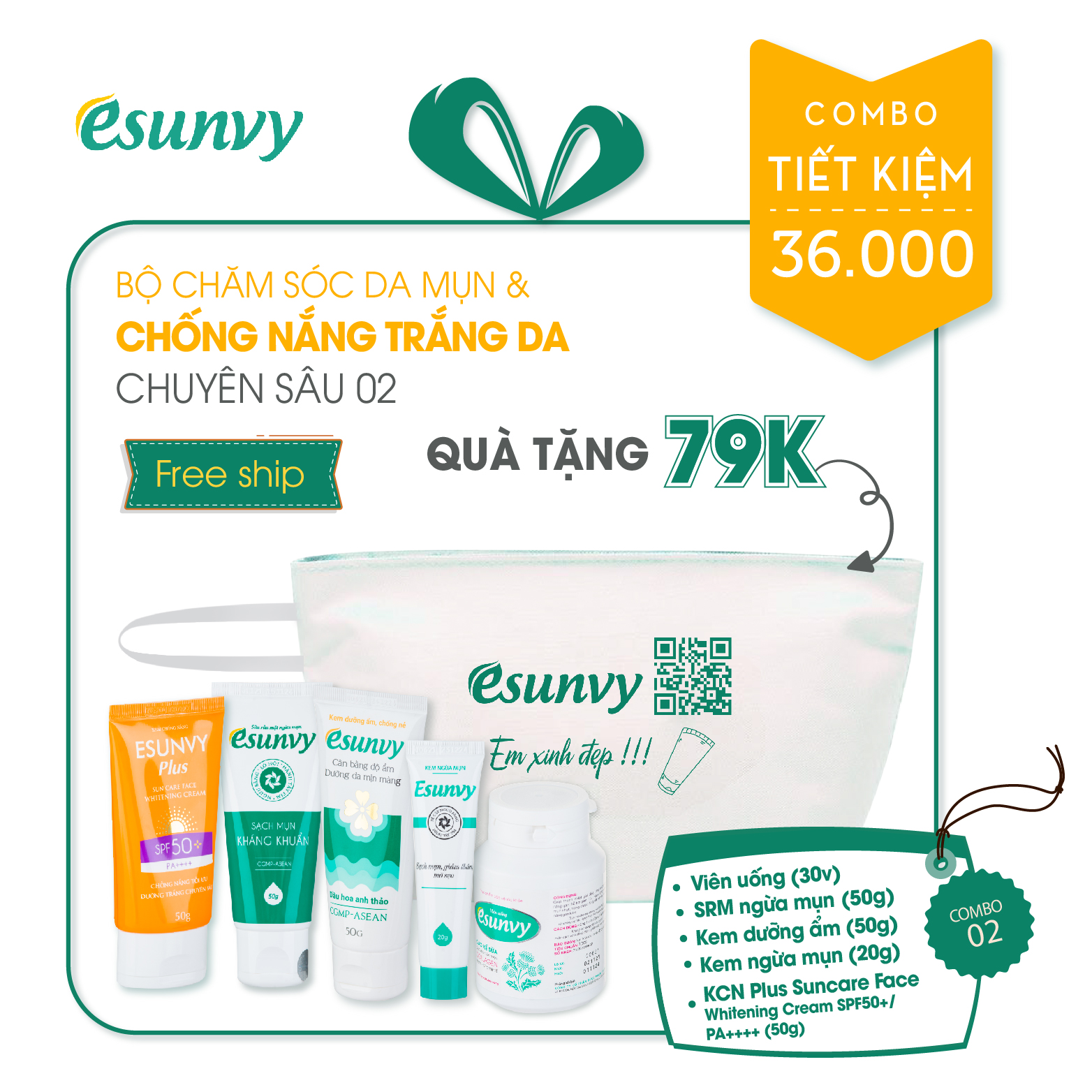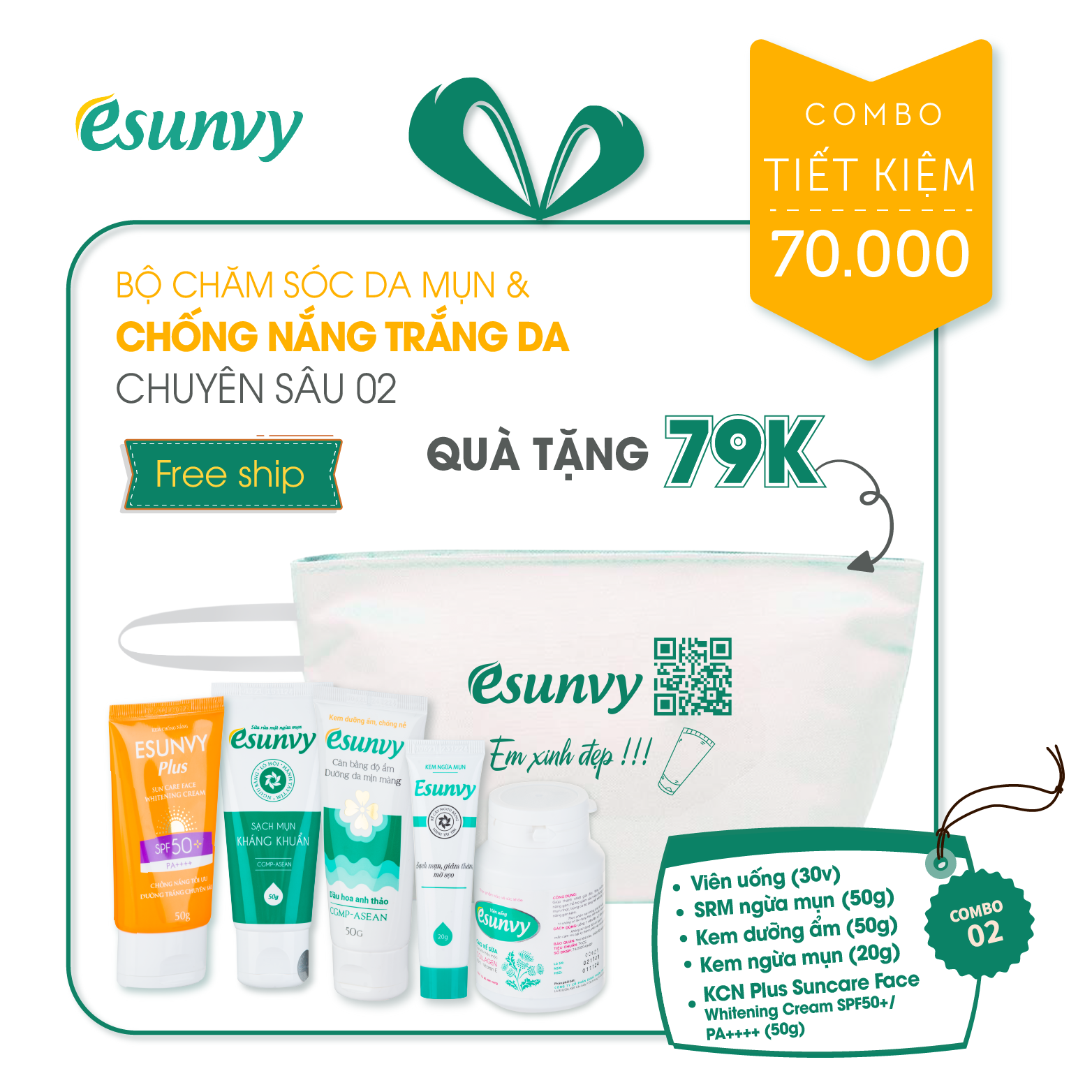 Bộ sản phẩm gồm 05 sản phẩm đáng sử dụng và được săn đón nhiều nhất của nhà Esunvy, với sự kết hợp của kem chống nắng dưỡng trắng yêu thích cùng bộ chăm sóc da cơ bản giúp chăm sóc làn da chuyên sâu và rạng ngời dưới nắng. Đặc biệt, vừa tiết kiệm đến 70.000 vnđ, lại gấp 1,5 lần lượng kem dưỡng ẩm.