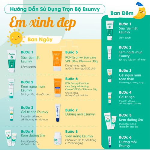 Bước 6: Kem chống nắng Esunvy Plus Sun care Body Whitening Cream SPF50+/ PA++++: Chống nắng dưỡng trắng da toàn thân, bôi lên các vị trí cần chống nắng trên toàn thân.